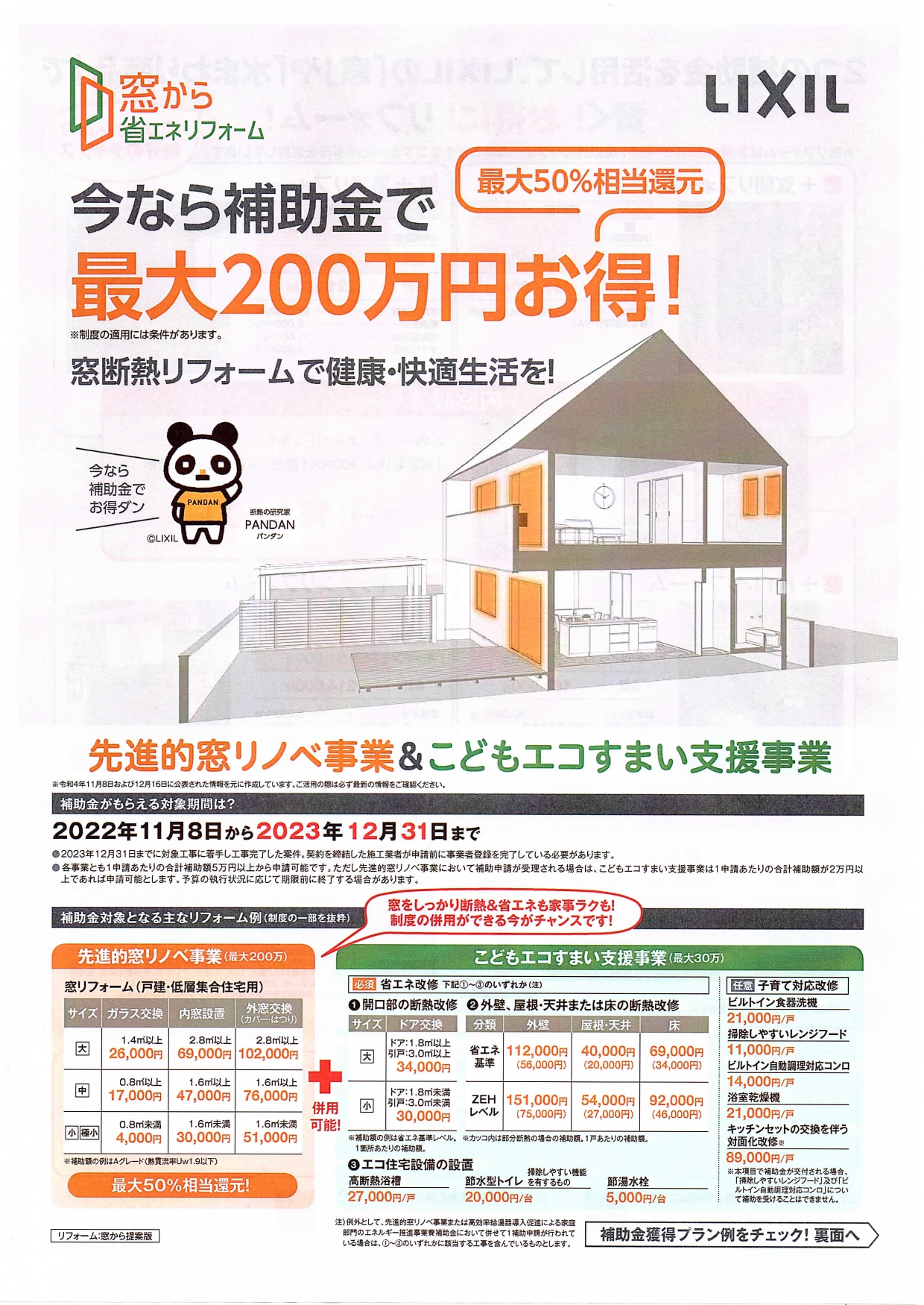2023年2月28日現在、国で行われる内窓リフォーム工事に関する補助金は以下になります。