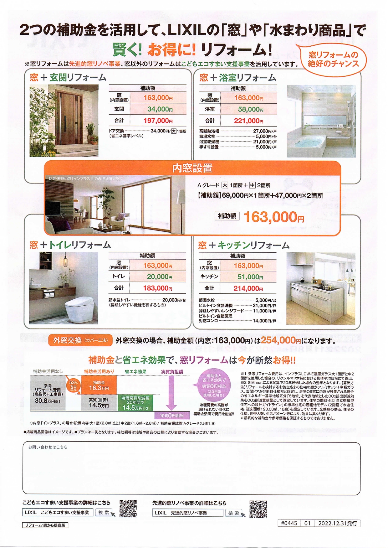 内窓のインプラス等の対象品を『5万ポイント以上』を工事させていただいた場合に対象となります。
